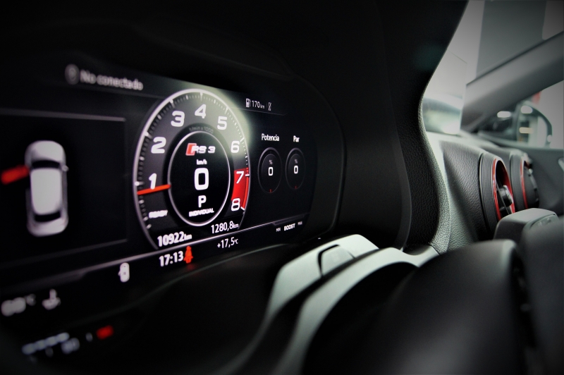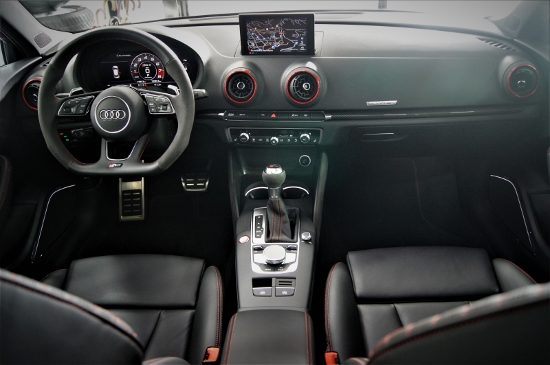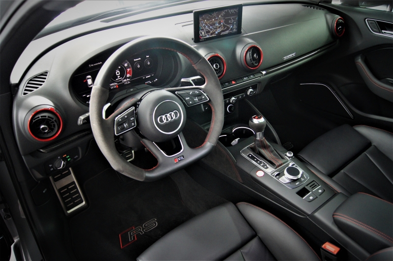 Extres: Sostre panoràmic obert - Navegador GPS - 4 tipus de conducció – Climatitzador bi-zona - Vidres elèctrics – Telèfon - AUX - USB - Sistema radio MMI - Sistema de so Bang&Olufsen - Bluetooth – Control per veu – Sistema MyAudi - Audi Connect LTE (4G) - Audi Connect amb SIM integrada - Color interior en cuir negre amb costures en vermell tipus niu d’abella – Seients Audi Sport - Seients calefactables - Sensors pluja - Sensors llums – Fars Matrix LED adaptatius – Llums de cortesia als retrovisors - Rentafars - Llandes 19'' - Alarma - Ordinador d'abord - Abs - Control tracció – Control pressió neumàtics - Recolzabraços central davanter i traser - Miralls electrocròmics - Retrovisors elèctrics - Retrovisors plegables elèctrics – Retrovisors calefactats - Volant multifuncions RS - Cruise control adaptatiu - Sensors aparcament davanters i trasers – Càmera d’aparcament - Pack il·luminació ambiental interior – Start-Stop – Keyless (Arrencada i obertura sense clau) - Leves al volant – Sistemes d’ajut a la conducció – Fre d’estacionament elèctric – Autohold – Acabat exterior ‘’Pack Negro’’ - Moldures interiors en fibra de carboni amb detalls en vermell - Virtual Cockpit - Suspensió Audi Magnetic Ride - Vidres tintats amb protecció U.V - Cinturons de seguretat amb costures en vermell....
